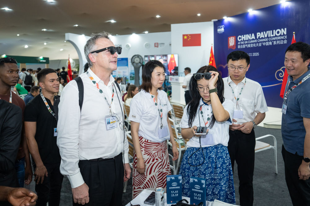 11月12日,在巴西贝伦,COP30展区的“中国角”,参观者体验了中国制造的智能设备。新华社记者 王天聪 摄